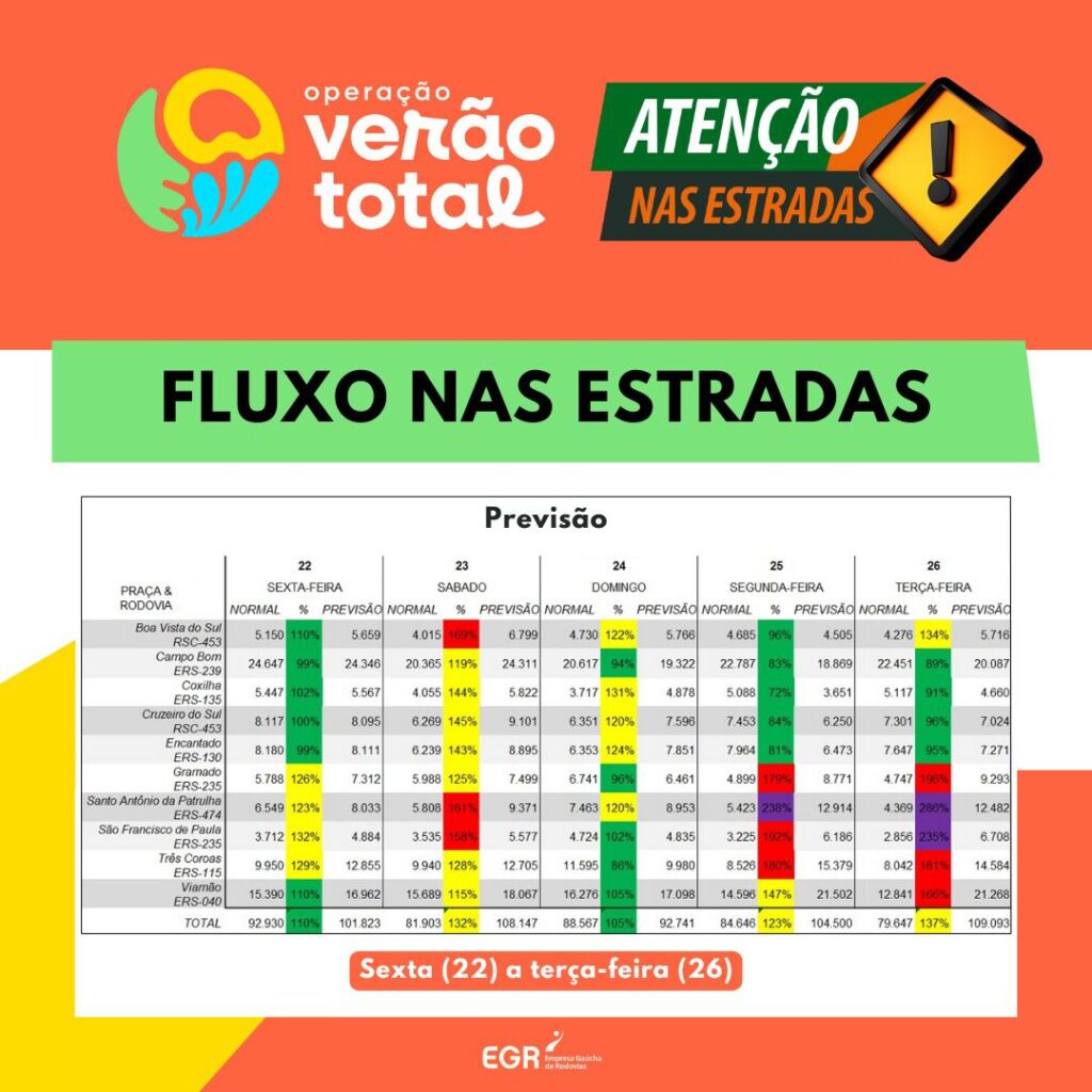 De acordo com a Gerência Operacional (Goper) da EGR, a previsão é que mais de 516 mil veículos trafeguem pelas rodovias administradas entre os dias 22 e 26 de dezembro, estimativa 21% superior em relação à média registrada em finais de semana normais. Há uma expectativa de maior fluxo tanto nas rodovias que ligam a região metropolitana ao litoral, seja pela ERS-040, por Viamão, ou pela ERS-474, em Santo Antônio da Patrulha, quanto nas rodovias que levam turistas e visitantes até a Serra Gaúcha e Hortênsias, utilizando a ERS-235, em Gramado e São Francisco de Paula, e a ERS-115, por Três Coroas.