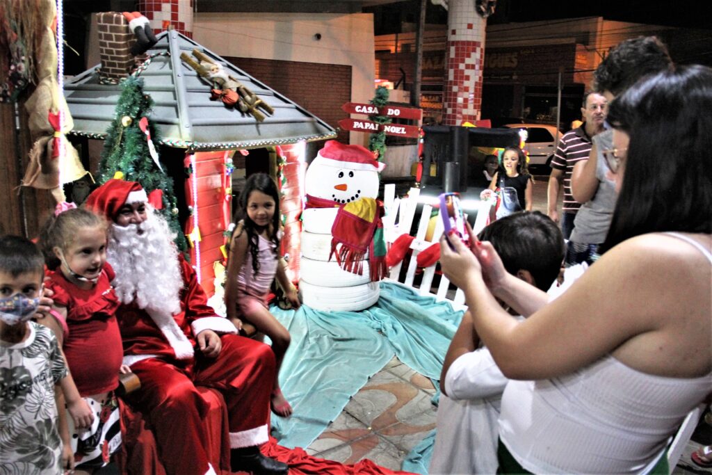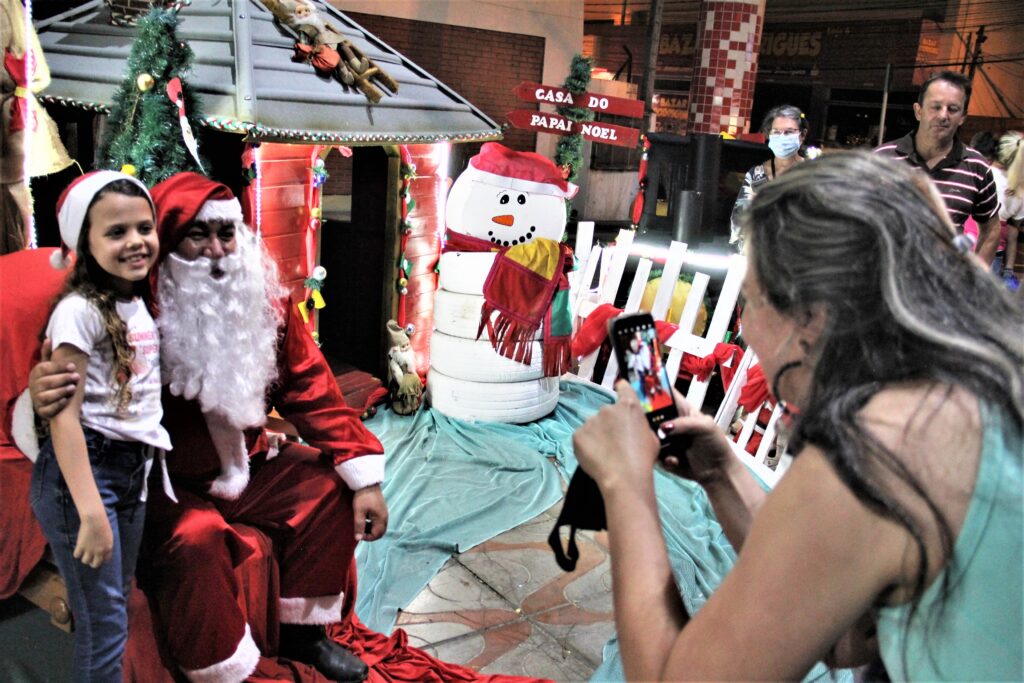Mas o grande momento da noite ainda estava por vir, quando o Papai Noel surgiu em meio à multidão, para a surpresa e alegria da garotada que aguardava com expectativa o momento de sua chegada. Encantadas, as crianças esperavam sua vez para fazer seu pedido e tirar uma foto com o simpático velhinho que atendeu a todas em sua casa montada junto à área coberta da praça.