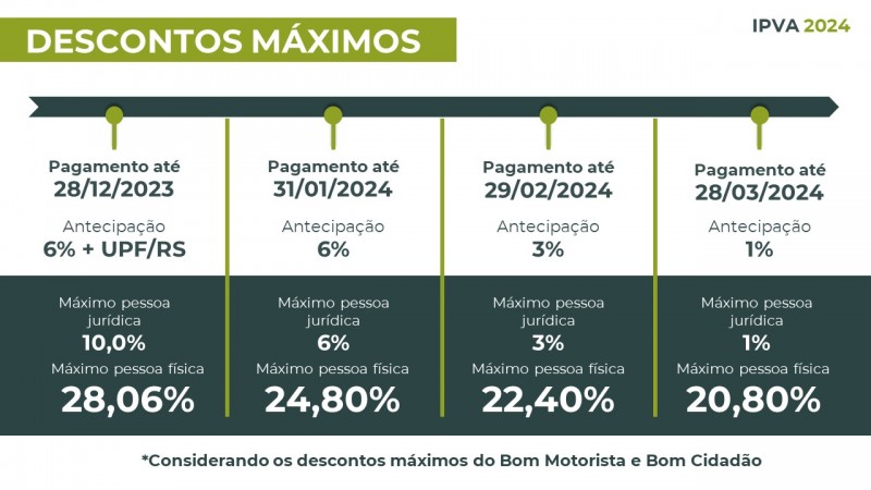 Quinta-feira (28/12) é o último dia para pagar o IPVA 2024 (Imposto sobre a Propriedade de Veículos Automotores) com descontos mais vantajosos para os contribuintes. Isso porque quem quitar o tributo até amanhã tem 6% de desconto e não incorrerá na variação da Unidade de Padrão Fiscal  (UPF/RS) – que pelos índices inflacionários deve ficar em 4,53% –, gerando uma redução potencial de 10,53%.