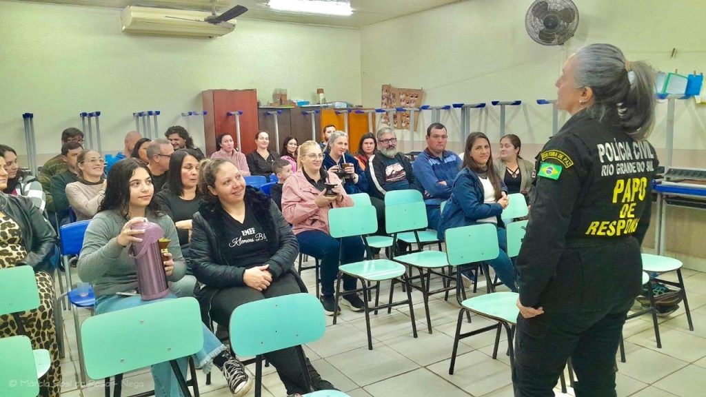 Na noite desta quarta-feira (27), a Polícia Civil realizou mais uma edição do Papo de Responsa, desta vez na Escola Municipal de Ensino Fundamental Santo Antônio, na cidade de Rolante. A atividade contou com a presença de 30 participantes, entre familiares e comunidade escolar.