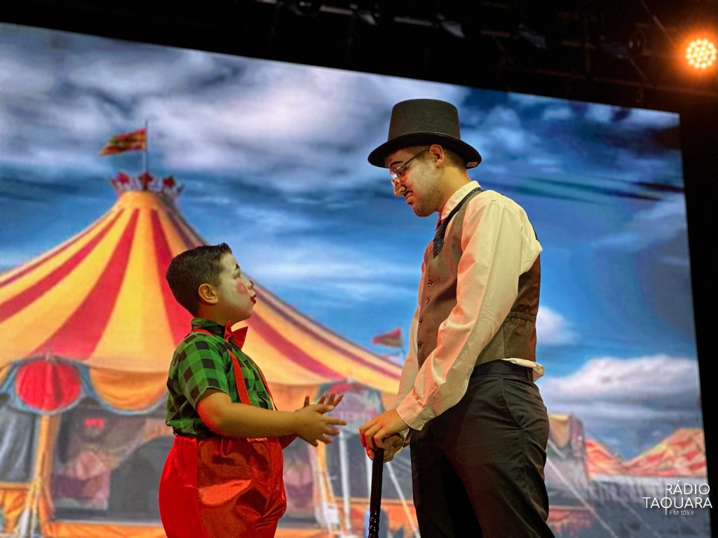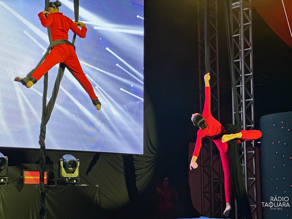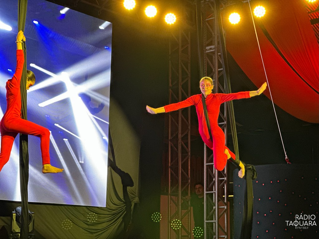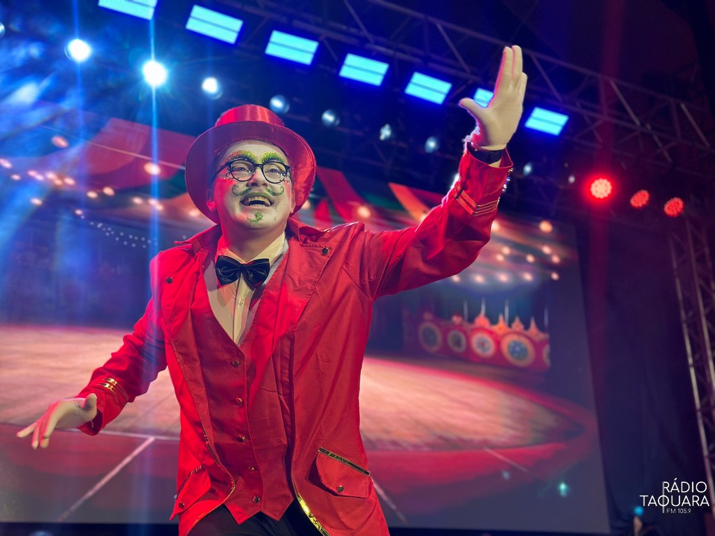 O espetáculo “O Natal que fez o Circo Brilhar” abriu oficialmente as comemorações natalinas de 2025 em Igrejinha, na noite desta sexta-feira (28), no Parque de Eventos Almiro Grings. A apresentação, protagonizada por 160 alunos do Centro Municipal de Atividades Educacionais (CEMAE), encantou o público com um musical que uniu teatro, música e performances inspiradas no universo circense, sem deixar de lado os valores tradicionais do Natal, como amor, solidariedade e união familiar.