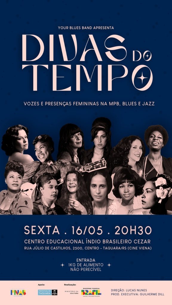 No próximo dia 16 de maio, às 20h30, o palco do Centro Educacional Índio Brasileiro Cezar, em Taquara, será tomado por vozes e sonoridades que atravessam gerações e fronteiras. O espetáculo “Divas do Tempo (Vozes e Presenças Femininas na MPB, Blues e Jazz)” promete uma noite de homenagens às grandes mulheres da música brasileira e internacional, com um repertório exclusivamente feminino. A entrada é gratuita, mediante a doação de 1kg de alimento não perecível.