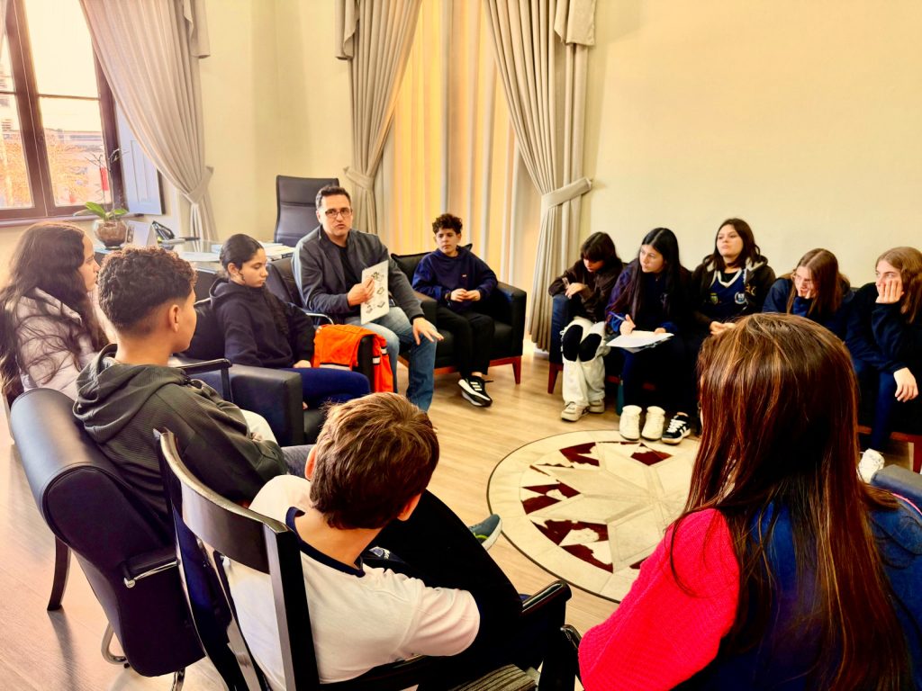 Estudantes da Escola Cívico-Militar (ECIM) de Taquara, integrantes da Comissão de Meio Ambiente e Qualidade de Vida (COM-VIDA) realizaram, na tarde desta quinta-feira (10), uma visita à Secretaria de Meio Ambiente, Defesa Civil e Causa Animal de Taquara. Acompanhados pela professora Isabel Kirsch, os alunos – do sexto ao nono ano – foram recebidos pelo secretário Luciano Campana, com quem dialogaram sobre as recentes enchentes que atingiram o município e propuseram ações voltadas à prevenção e ao cuidado com áreas de risco.