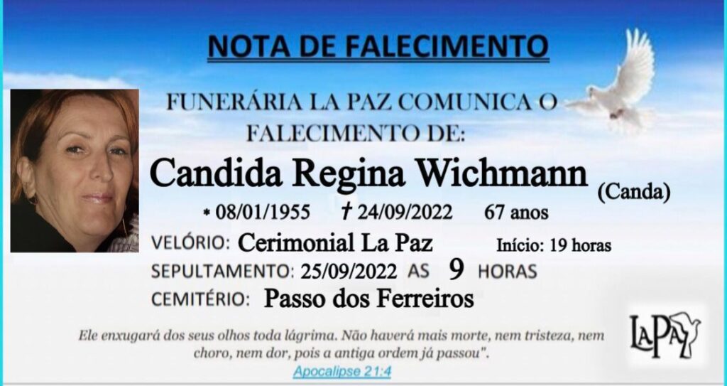 Os familiares comunicam com pesar o falecimento de Candida Regina Wichmann (Canda), ocorrido neste sábado (24/9/2022), aos 67 anos. O velório ocorrerá no Cerimonial La Paz, na rua Tristão Monteiro, em Taquara, com início às 19 horas deste sábado. O sepultamento será neste domingo (25/9/2022), às 9 horas, no Cemitério de Passo dos Ferreiros. Funerária La Paz comunicou o falecimento de Candida Regina Wichmann (Canda).