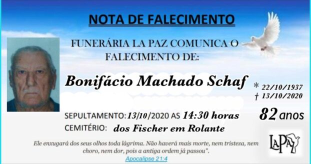 Comunicam com pesar o falecimento de Bonifácio Machado Schaf, ocorrido nesta terça-feira (13/10/2020), aos 82 anos. O sepultamento ocorrerá às 14h30min, no Cemitério dos Fischer, em Rolante.