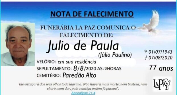 netos, bisnetos e demais familiares participam o falecimento de Júlio de Paula (Júlio Paulino), ocorrido nesta sexta-feira (7/8/2020) aos 77 anos. O velório ocorrerá em sua residência na localidade de Santa Cruz da Concórdia, a partir das 12 horas deste sábado (8), e o sepultamento será neste sábado (8/8/2020), às 15 horas, no Cemitério de Paredão Alto.