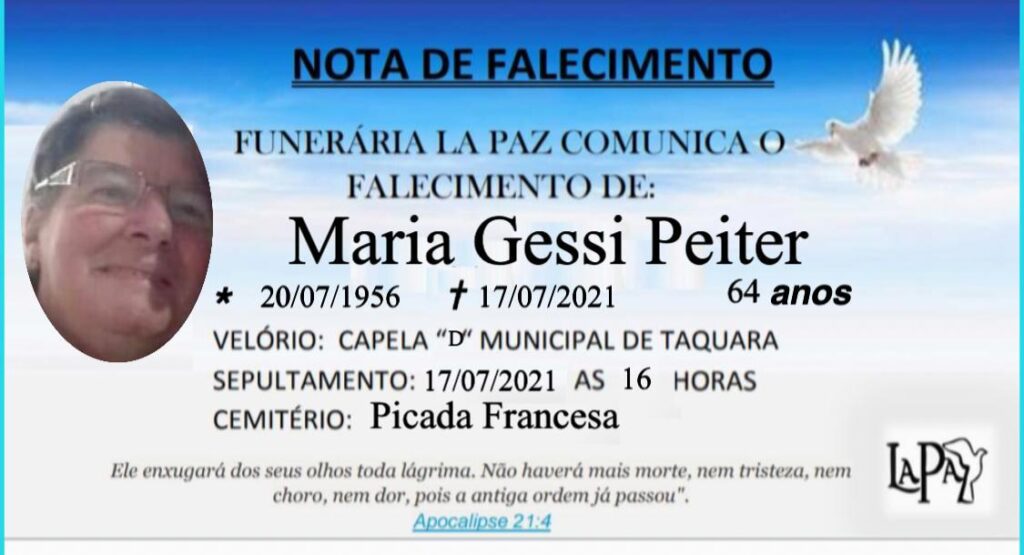 comunicam com pesar o falecimento de Maria Gessi Peiter, ocorrido neste sábado (17/07/2021), aos 64 anos. O velório ocorre na capela “D” municipal de Taquara e o sepultamento será às 16 horas deste sábado, no Cemitério de Picada Francesa, no interior de Taquara.