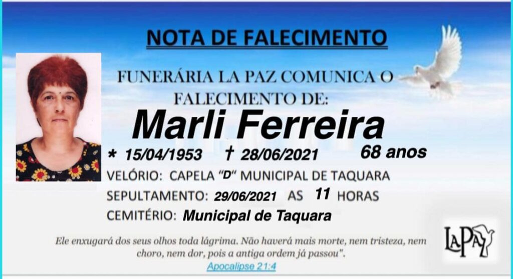 e demais familiares comunicam com pesar o falecimento de Marli Ferreira, ocorrido nesta segunda-feira (28/06/2021), aos 68 anos. O velório ocorrerá a partir das 7 horas desta terça-feira (29/06/2021), na Capela “D” Municipal de Taquara e o sepultamento será às 11 horas, no Cemitério Municipal de Taquara.
