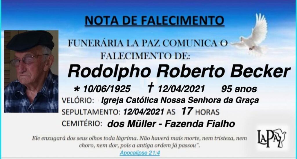 Comunicam com pesar o falecimento de Rodolpho Roberto Becker, ocorrido nesta segunda-feira (12/4/21), aos 95 anos. O velório ocorrerá na Igreja Católica Nossa Senhora da Graça, em Fazenda Fialho, interior de Taquara, a partir das 14 horas. O sepultamento será às 17 horas desta segunda-feira, no Cemitério dos Müller, em Fazenda Fialho.