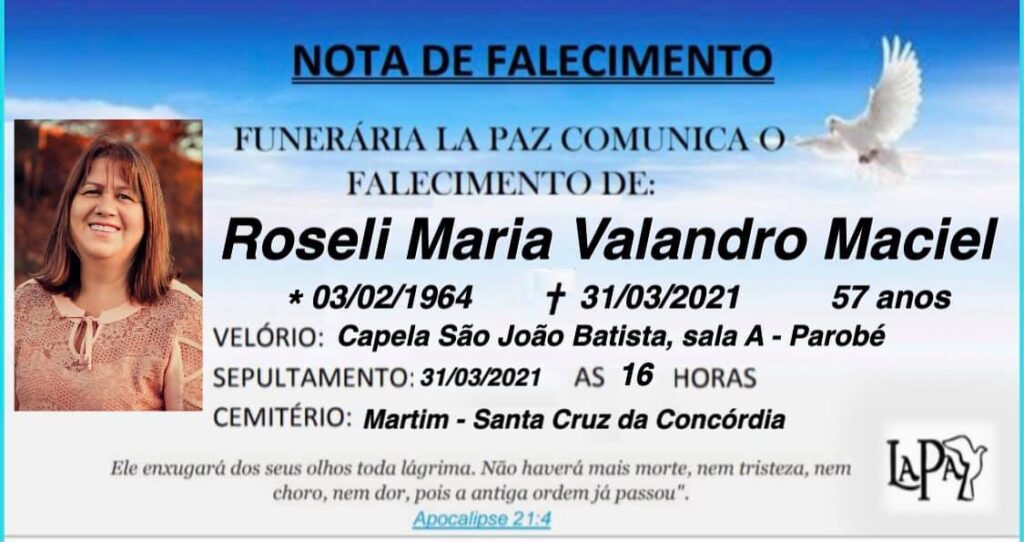 comunicam com pesar o falecimento de Roseli Maria Valandro Maciel, ocorrido nesta quarta-feira (31/3/2021), aos 57 anos. O velório ocorrerá a partir das 10 horas, na capela São João Batista, sala A, em Parobé. O sepultamento será às 16 horas, no Cemitério Martim, em Santa Cruz da Concórdia.