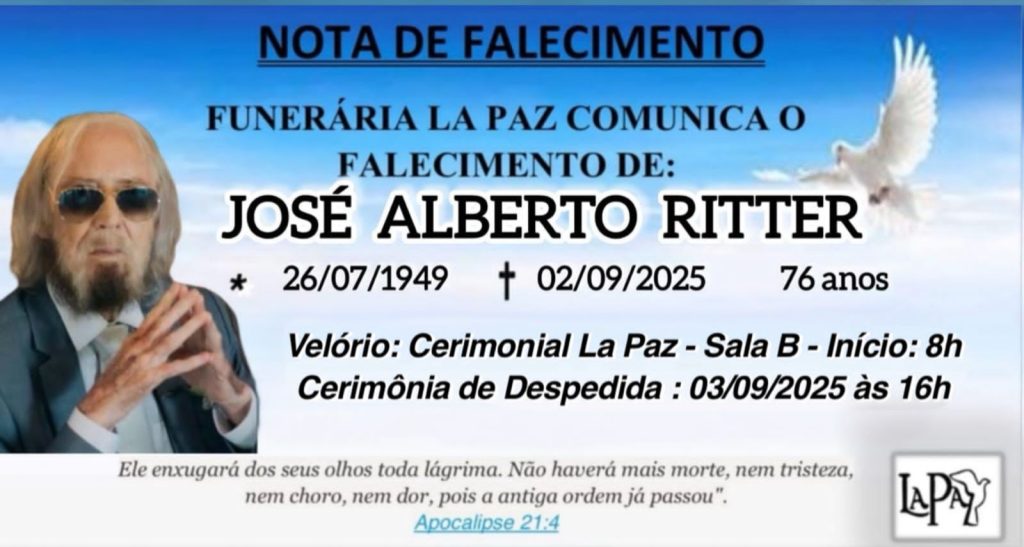Obituário Falecimento | José Alberto Ritter (Dr. Ritter)Publicado em: 03/09/2025 - 08:26 por Ronaldo Siebel