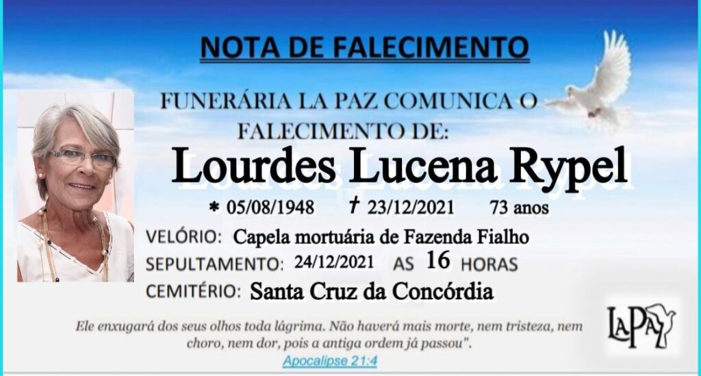 comunicam com pesar o falecimento de Lourdes Lucena Rypel, ocorrido nesta quinta-feira (23/12/2021), aos 73 anos. O velório ocorrerá na capela mortuária de Fazenda Fialho e o sepultamento será às 16 horas desta sexta-feira (24/12), no Cemitério de Santa Cruz da Concórdia.