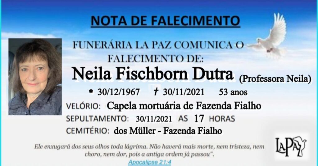 comunicam com pesar o falecimento de Neila Fischborn Dutra, ocorrido nesta terça-feira (30/11/2021), aos 53 anos. O velório ocorrerá na capela mortuária de Fazenda Fialho, no interior de Taquara, e o sepultamento será às 17 horas, no Cemitério dos Müller, em Fazenda Fialho.