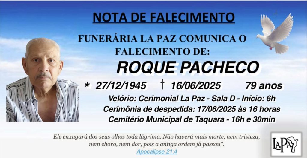 Obituário Falecimento | Roque PachecoPublicado em: 17/06/2025 - 08:55 por Ronaldo SiebelEsposa Hilária, filha Karine, netas, genro e demais parentes participam com pesar o falecimento de ROQUE PACHECO.