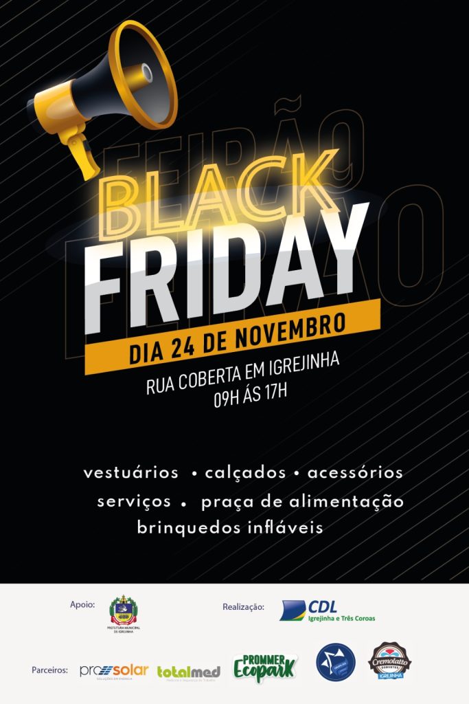 A Black Friday não poderia passar em branco na CDL de Igrejinha e Três Coroas. Por isso, o tradicional evento de descontos promovido pela entidade chega na versão Feirão Black Friday. Será no domingo (24 de novembro), das 09 às 17 horas, simultaneamente nos dois municípios. Em Três Coroas, será na Rua Coberta, junto à Praça Affonso Saul. Já em Igrejinha, será na Rua Coberta ao lado da Praça Dona Luiza.
