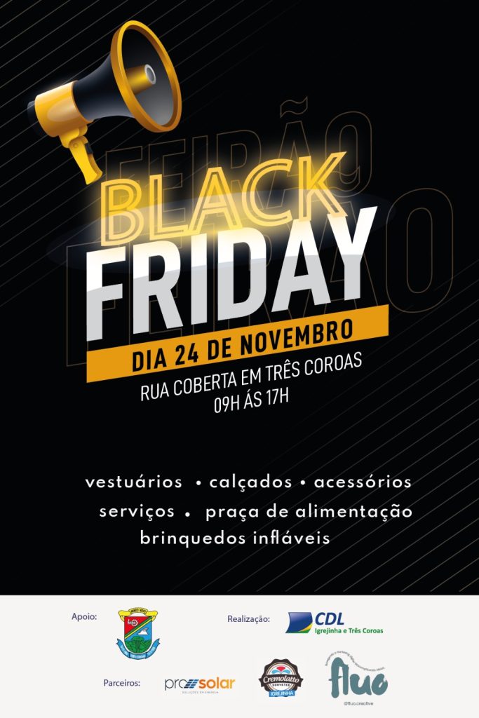 O Feirão Black Friday é uma realização da CDL de Igrejinha e Três Coroas, possível através do patrocínio de Pro Solar, Totalmed, Prommer Ecopark, JGS Monitoramento, Cremolato e Fluo Creative.