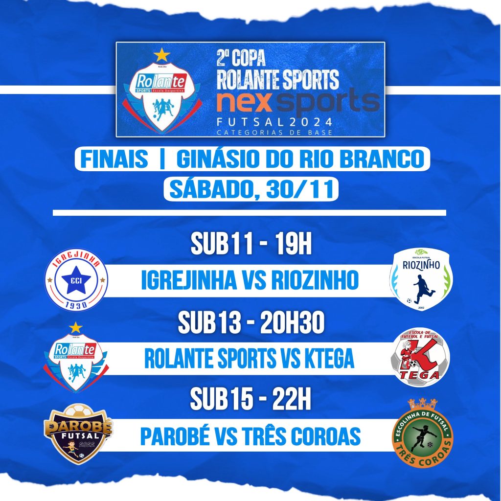 Os jogos finais da 2ª Copa Rolante Sports/Nex Sports de Futsal – Categorias de Base serão realizados neste sábado, 30 de novembro, no Ginásio do Rio Branco, em Rolante. O evento, organizado pela Associação Desportiva Rolante Sport, encerra uma temporada marcada por disputas intensas nas categorias Sub 9 (amistoso), Sub 11, Sub 13 e Sub 15.