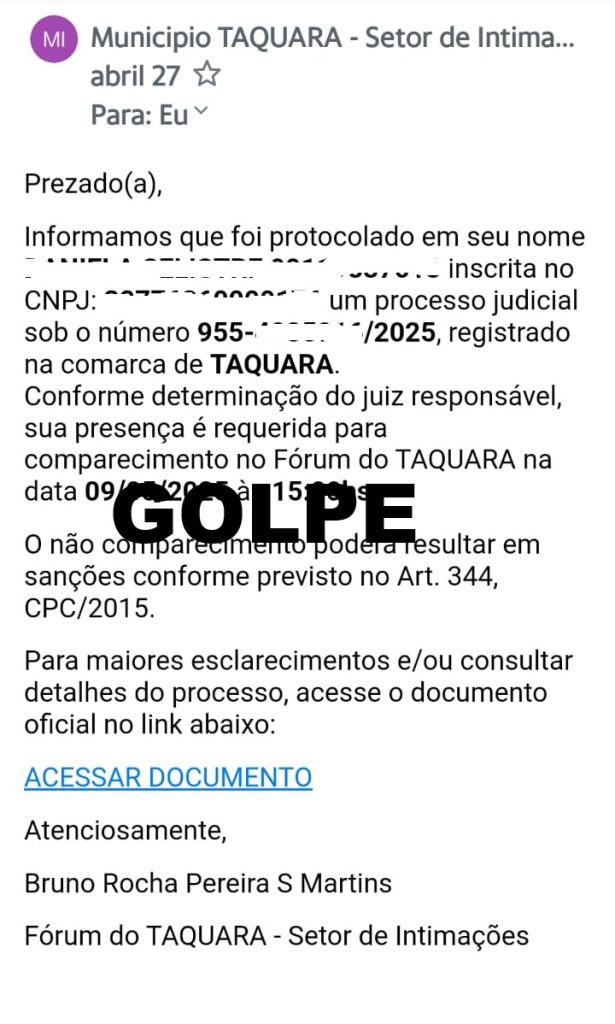 Contribuintes de Taquara estão sendo alvo de um golpe envolvendo e-mails falsos que simulam notificações de dívidas em nome de um “Setor de Intimações” do município. As mensagens informam supostos débitos relacionados a empresas e incluem links para detalhes da cobrança.