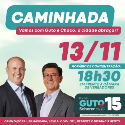 Em uma transmissão ao vivo realizada na noite deste domingo, o candidato à Prefeitura de Igrejinha pelo MDB, Guto Scherer, anunciou que a Coligação Avança Igrejinha vai promover uma grande caminhada na próxima sexta-feira, dia 13 de novembro, com concentração em frente à Câmara de Vereadores a partir das 18 horas e 30 minutos.