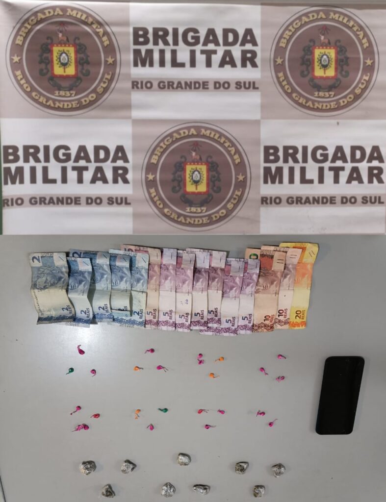 Ao perceber a aproximação da viatura, um indivíduo, com uma pochete preta, saiu correndo e tentou pular um muro, circunstância que justificou a sua abordagem. Conforme a BM de Taquara, durante a realização da busca pessoal, foram encontradas cerca de 25 pedras de crack, nove tabletes de maconha, além do valor de R$ 90, fracionados em notas pequenas, e um celular da marca Motorola.