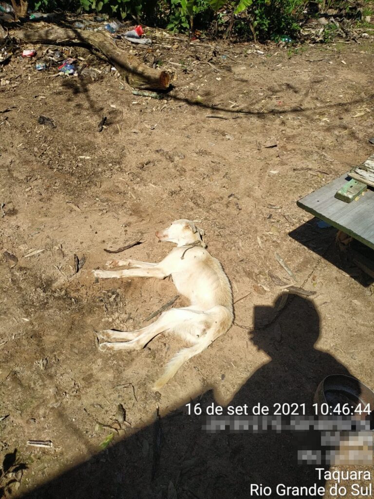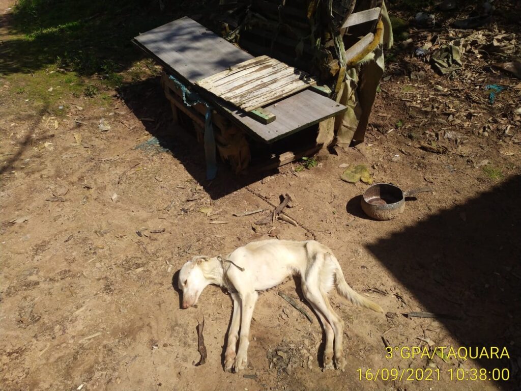 Segundo os policiais, que receberam a informação de que os cães viviam em situação degradante, foi encontrado no local um cachorro de pelagem branca e da raça Galgo, em situação de desnutrição extrema, com feridas pelo corpo e infestação parasitária, além de não ter um abrigo adequado, acesso à água ou alimento, e estava amarrado em corrente curta e já não se movia mais devido a sua fraqueza.