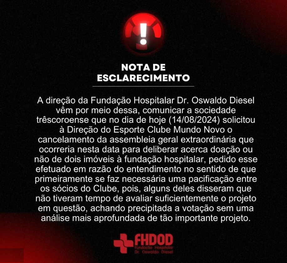 Conforme a Fundação Hospitalar, o comunicado, endereçado à sociedade três-coroense, informa que solicitou à direção do Esporte Clube Mundo Novo a suspensão da assembleia geral extraordinária, que seria realizada para deliberar acerca da doação ou não de dois imóveis. Segundo a casa de saúde, o pedido se fez necessário em razão de uma discordância entre os sócios do Clube sobre a definição da doação de terreno.