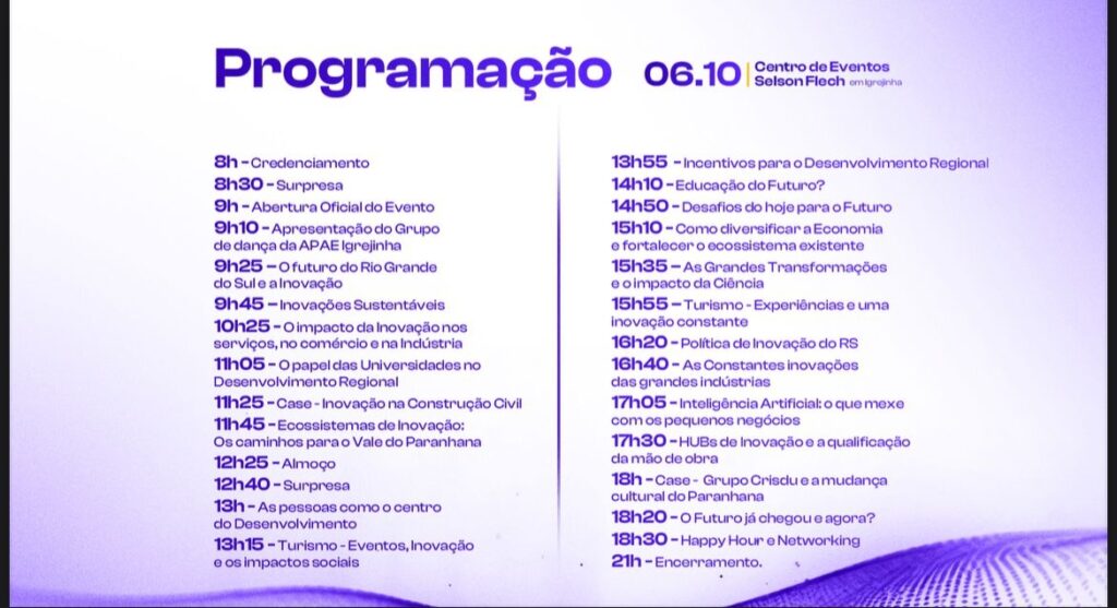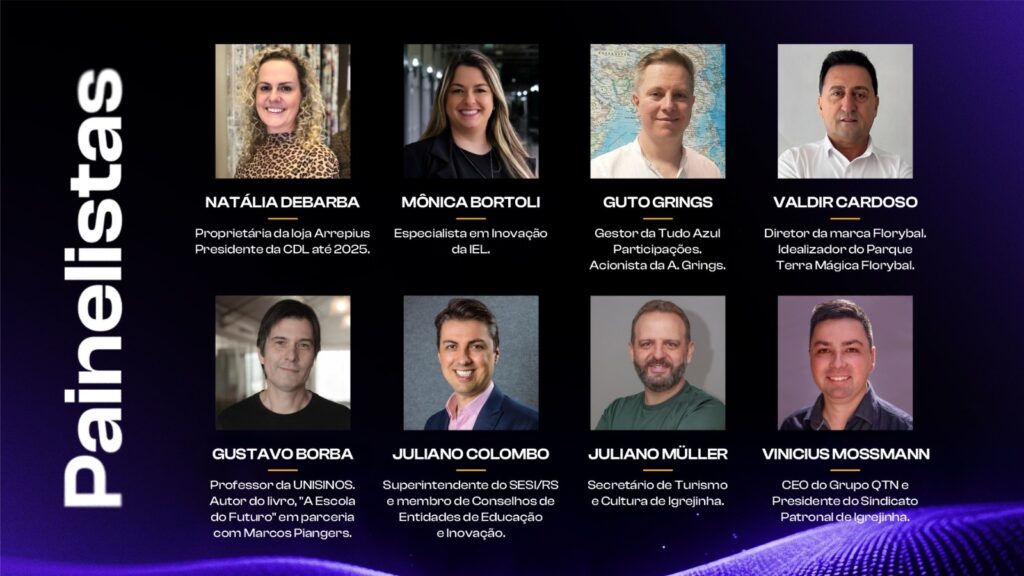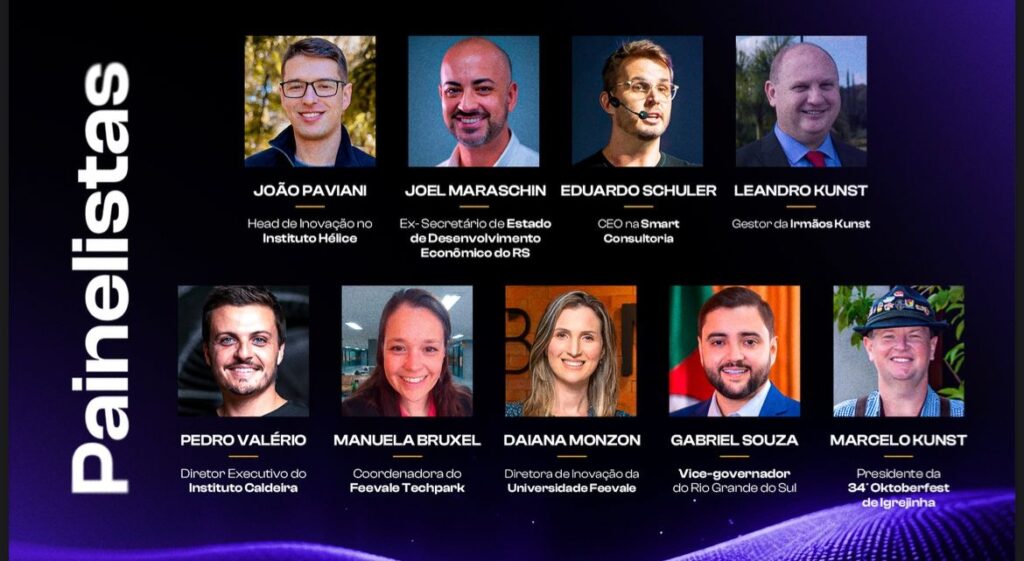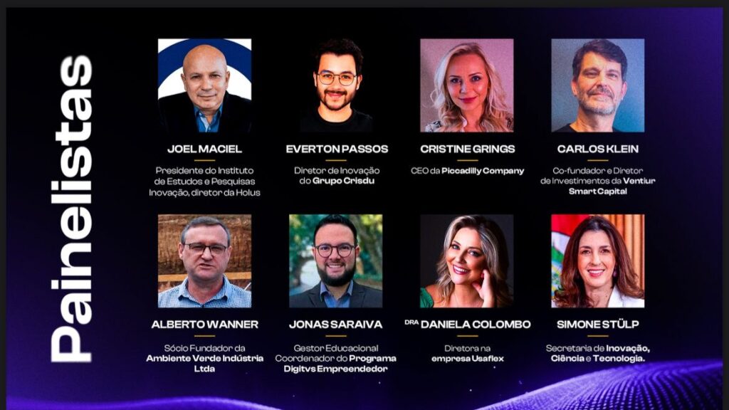 Ao longo do dia, os participantes poderão acompanhar relatos de palestrantes como Pedro Valério, diretor executivo do Instituto Caldeira; João Paviani, head de inovação no Instituto Hélice; Gabriel Souza, vice-governador do Rio Grande do Sul, entre diversos outros.