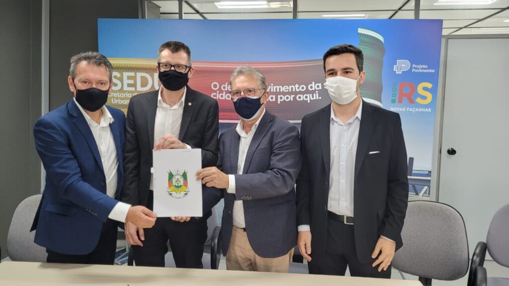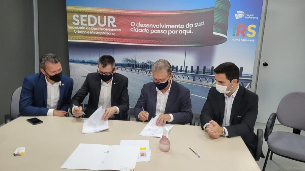 O prefeito de Igrejinha, Leandro Hörlle, acompanhado do secretário de Planejamento e Meio Ambiente Jeferson Corá, e do deputado estadual Dalciso Oliveira, assinou, nesta terça-feira (18), o contrato com o governo do Estado que garantirá o repasse de R$ 2 milhões. O recurso servirá para complementar o investimento que a Prefeitura de Igrejinha está realizando para a conclusão da pavimentação asfáltica da Estrada Edgar Willy Wolff.