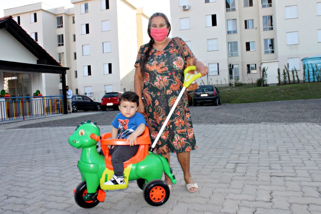 Cristofer de Oliveira, de um ano, e sua avó Neuza Teixeira comemoram a abertura da nova escola