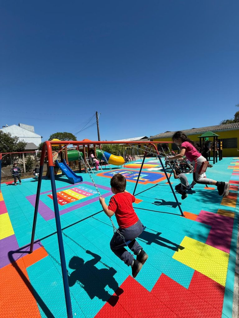 O novo espaço conta com piso modular, seis brinquedos e bancos, proporcionando um ambiente mais seguro para as crianças da escola e da comunidade