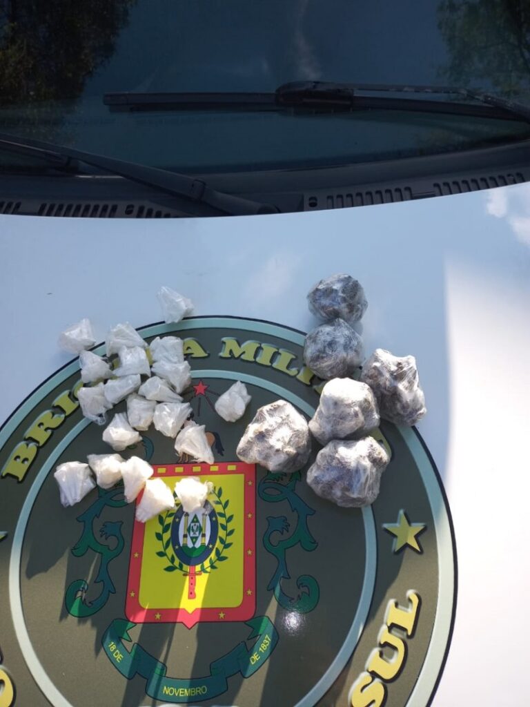 Dentro do automóvel foi localizado uma sacola plástica, contendo 140 pinos de cocaína e 80 porções de maconha. O automóvel e as substâncias foram apreendidos e apresentados na delegacia de polícia.