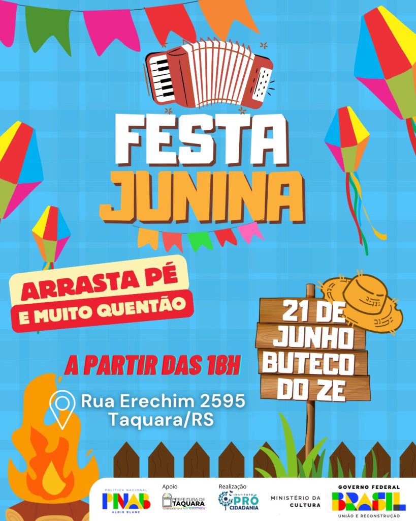 Os organizadores informam que haverá distribuição gratuita de um copo de quentão para quem comparecer vestido de caipira. A festa contará ainda com danças típicas e outras comidas tradicionais do período junino. A realização é do Instituto Pró-Cidadania, com apoio da Prefeitura de Taquara, Ministério da Cultura e do Programa Nacional Aldir Blanc (PNAB), por meio da Lei Aldir Blanc.