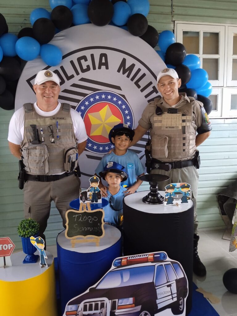 Além dos familiares e amigos, Samuel e Tiago também celebraram seu aniversário com os soldados Gilmar e Tiago, registrando a visita em uma foto junto a decoração da festa.