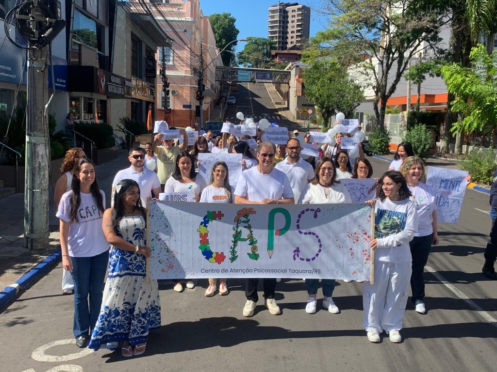 Vestidos de branco e com balões da mesma cor, símbolo do movimento, os participantes percorreram a Rua Júlio de Castilhos, chamando a atenção da população para o autocuidado e para a necessidade de olhar com mais empatia para o outro. A atividade teve início em frente à Câmara de Vereadores e reuniu profissionais da rede municipal de saúde, gestores e moradores do município.