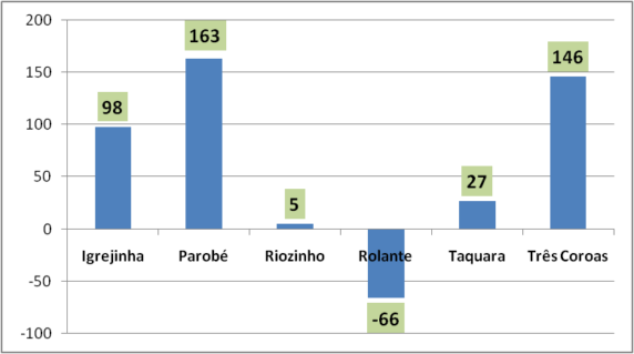 O melhor desempenho na geração de empregos neste começo de ano foi de Parobé, com 163 vagas criadas. Depois, aparece Três Coroas, com 146, seguido de Igrejinha, com 98. Em Taquara, o ano começou com 27 empregos criados, enquanto em Riozinho foram cinco vagas. O único município com saldo negativo na geração de empregos foi Rolante, que teve 66 postos fechados.