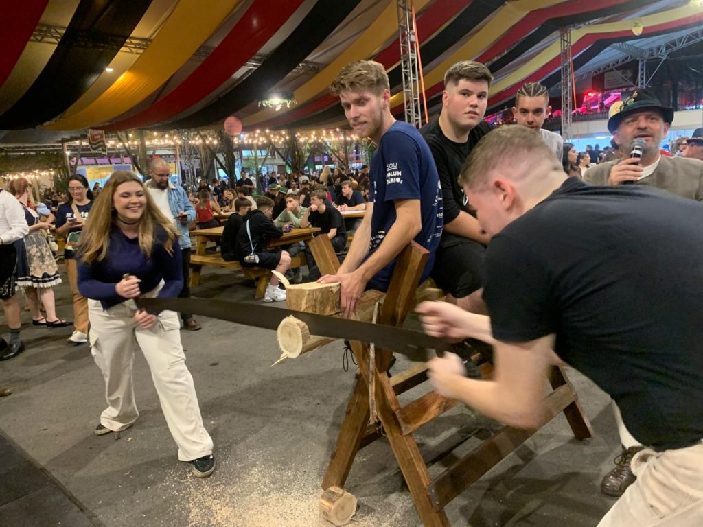 Os tradicionais Jogos Germânicos da 36ª Oktoberfest de Igrejinha começaram nesta sexta-feira (17), em um formato de apresentação interativa que deu ao público e participantes a oportunidade de experimentar uma das provas mais conhecidas: serrar toras de madeira. A atividade aconteceu no Lonão, um dos espaços mais movimentados do parque.