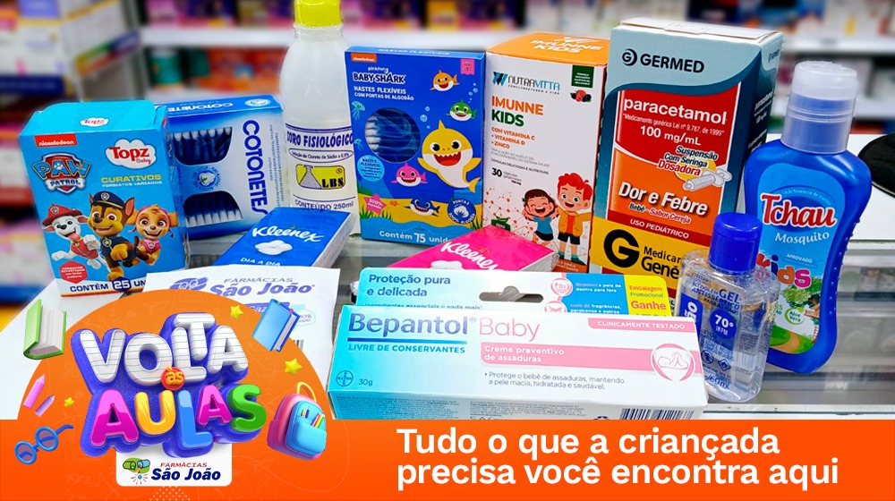 A farmacêutica Natália Tristacci da Rede de Farmácias São João destaca a importância do kit básico para as crianças. “Na Educação Infantil e nos anos iniciais, o kit auxilia os professores nos cuidados com os pequenos. Sempre é bom ter produtos que não ofereçam risco, caso a criança abra ou tenha acesso aos materiais,” explica Natália.