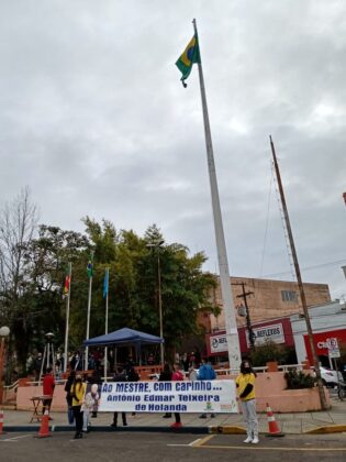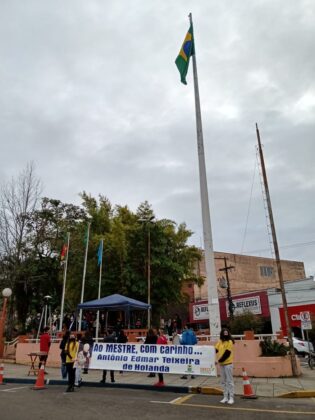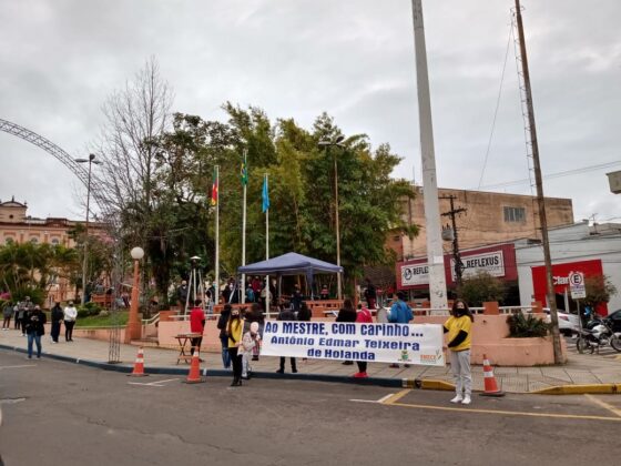 O frio e todas as dificuldades impostas pela pandemia do novo coronavírus não impediram que dezenas de pessoas dedicassem um momento do dia, nesta terça-feira (1º), para prestar homenagens in memoriam ao professor Antônio Edmar Teixeira de Holanda, que faleceu no dia 24 de agosto. Como anunciado nesta segunda-feira (31), a Secretaria Municipal de Educação, Cultura e Esportes (Smece) organizou uma carreata que foi realizada de forma simultânea à 83ª Corrida do Fogo Simbólico da Pátria. A programação aconteceu na Rua Júlio de Castilhos, partindo da sede da Smece até a Praça Marechal Deodoro.
