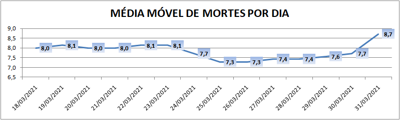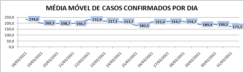 A média móvel de novos casos na região é de 171,3 por dia. Na comparação com o dado de sete dias atrás, a média móvel apresenta queda de 6%. Já com relação ao índice de 14 dias atrás, o valor é de 27% de queda no registro médio diário de casos.
