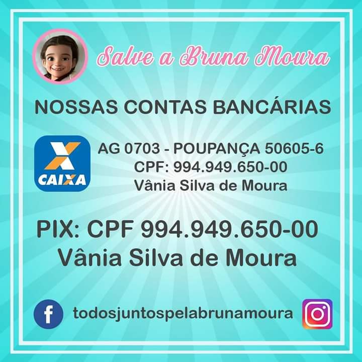 Além da doação de sangue, a família tem passado por dificuldades financeiras, devido aos gastos com alguns medicamentos e exames, que precisam ser realizados na rede de saúde particular. Para isso, a mãe de Bruna disponibilizou uma conta bancária e um número de Pix, onde a pessoa que não puder doar sangue, mas queira contribuir de alguma forma, possa depositar qualquer valor para colaborar com as despesas. Confira abaixo as formas para colaborar com essa campanha e ajudar a Bruninha:
