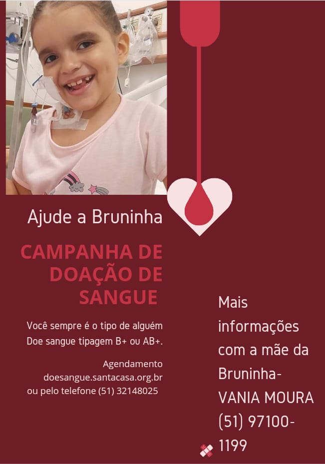 Uma menininha vem passando por momentos difíceis, que nem mesmo alguns adultos teriam forças para enfrentar. Trata-se de Bruna de Moura, de apenas seis anos de idade. Moradora de Taquara, ela foi diagnosticada com Leucemia Miolóide Aguda, no dia 31 de agosto de 2021 e, a partir daí, vem enfrentando intensas e doloridas sessões de quimioterapia, exames e transfusões de sangue.