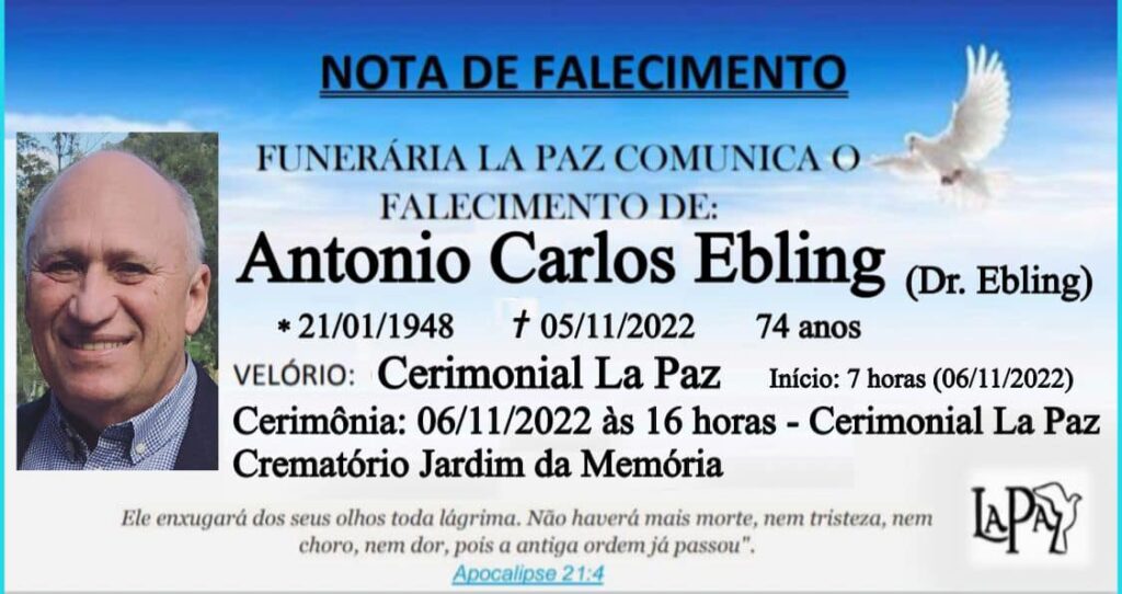 Morreu neste sábado (5/11), aos 74 anos, o médico Antônio Carlos Ebling, conhecido como Dr. Ebling, ex-prefeito de Taquara. As informações sobre as causas da morte não foram divulgadas pela família. O velório ocorrerá no Cerimonial La Paz, com início às 7 horas deste domingo (6/11). A cerimônia de despedida será às 16 horas, no mesmo local, e depois haverá cremação no Crematório Jardim da Memória, em Novo Hamburgo.