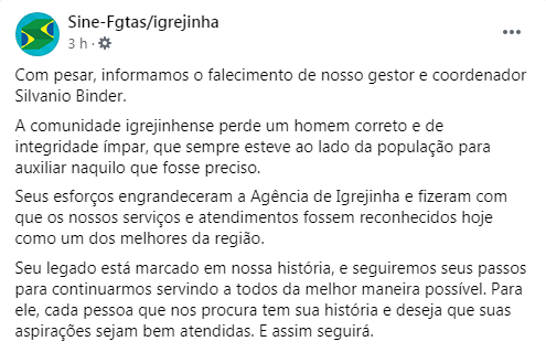 Silvanio deixa mulher e um casal de filhos. A agência do Sine igrejinhense divulgou uma nota de pesar e lamentou a perda do colega. O sepultamento ocorreu na tarde deste sábado, no Cemitério Católico Voluntário de Igrejinha.