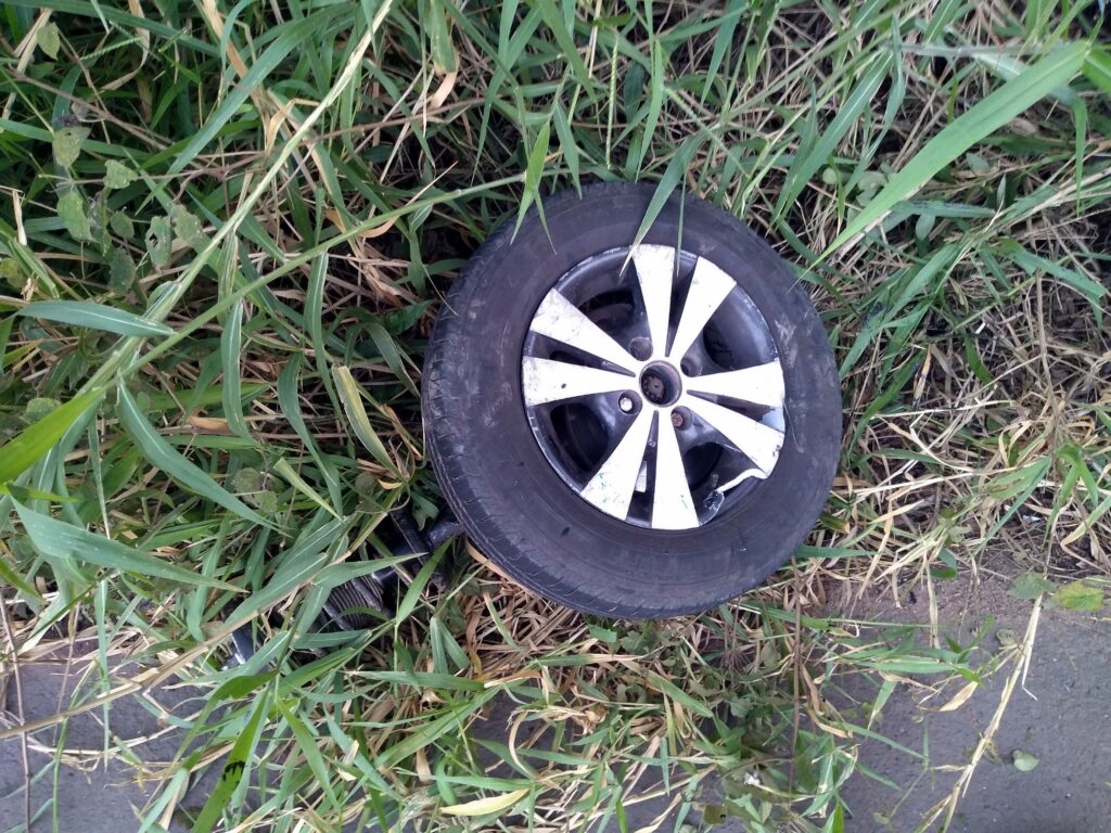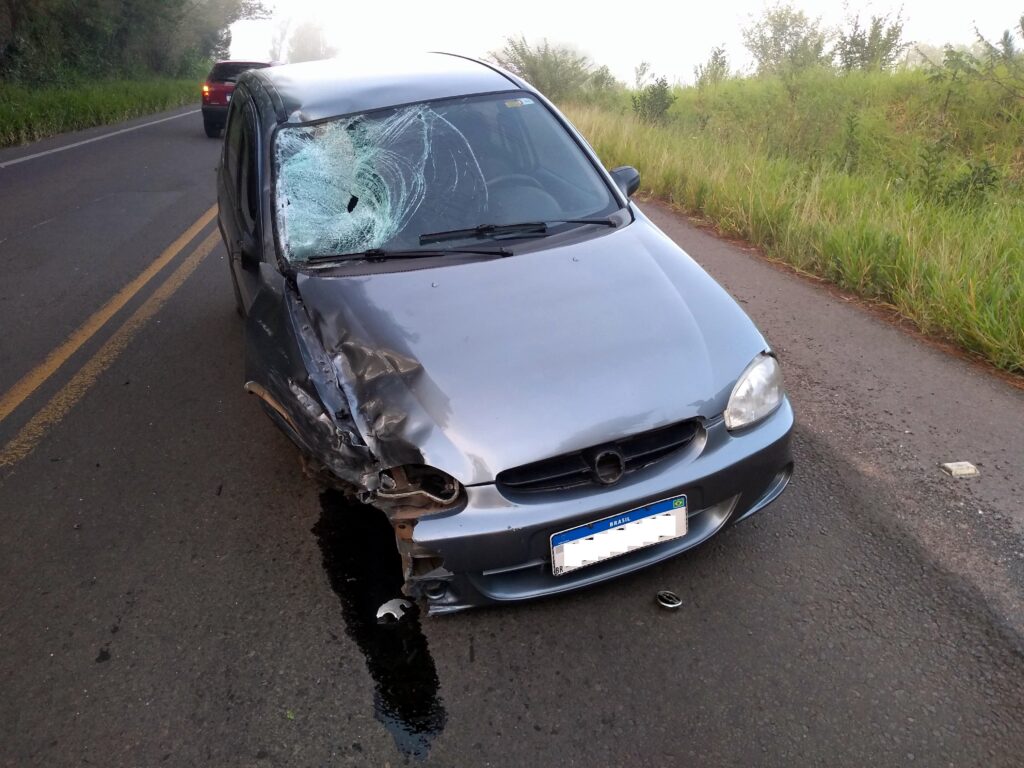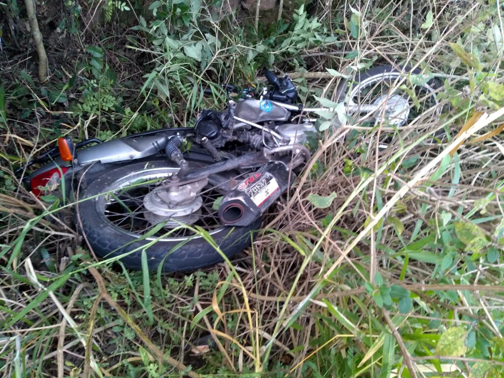 Com o impacto da batida, uma das rodas dianteiras do carro foi arrancada e a motocicleta foi jogada para fora da pista, caindo em uma valeta.