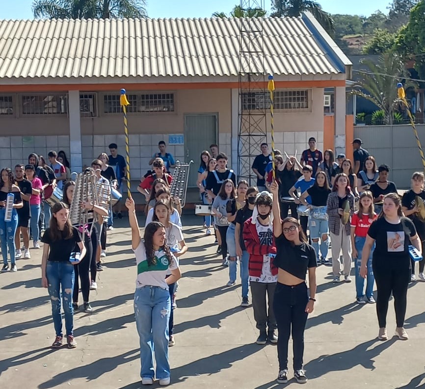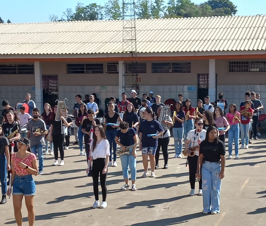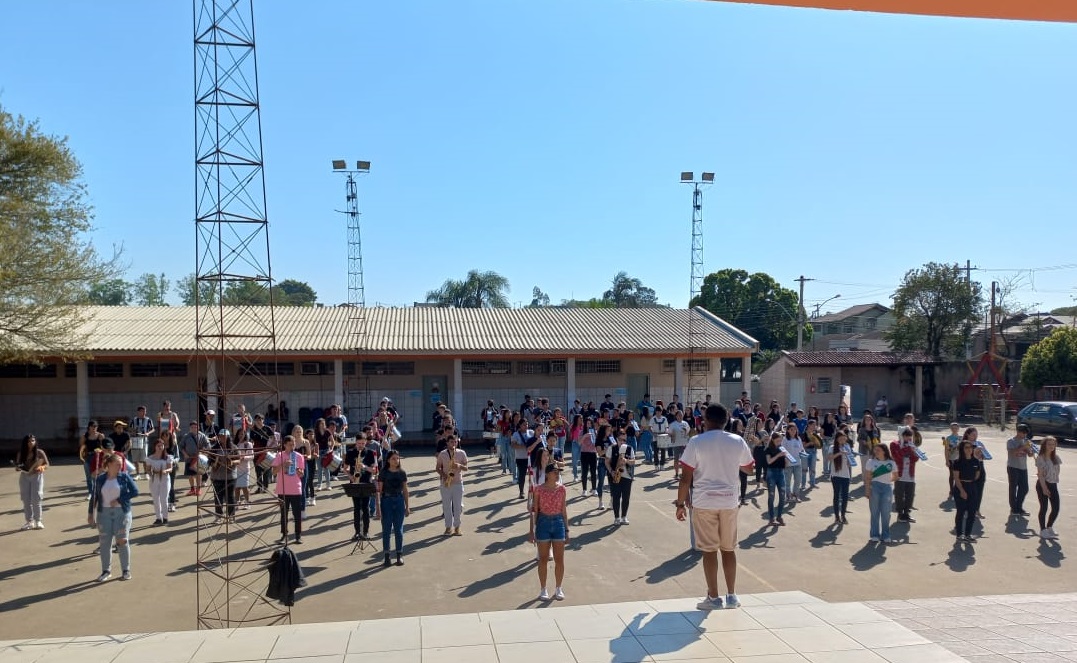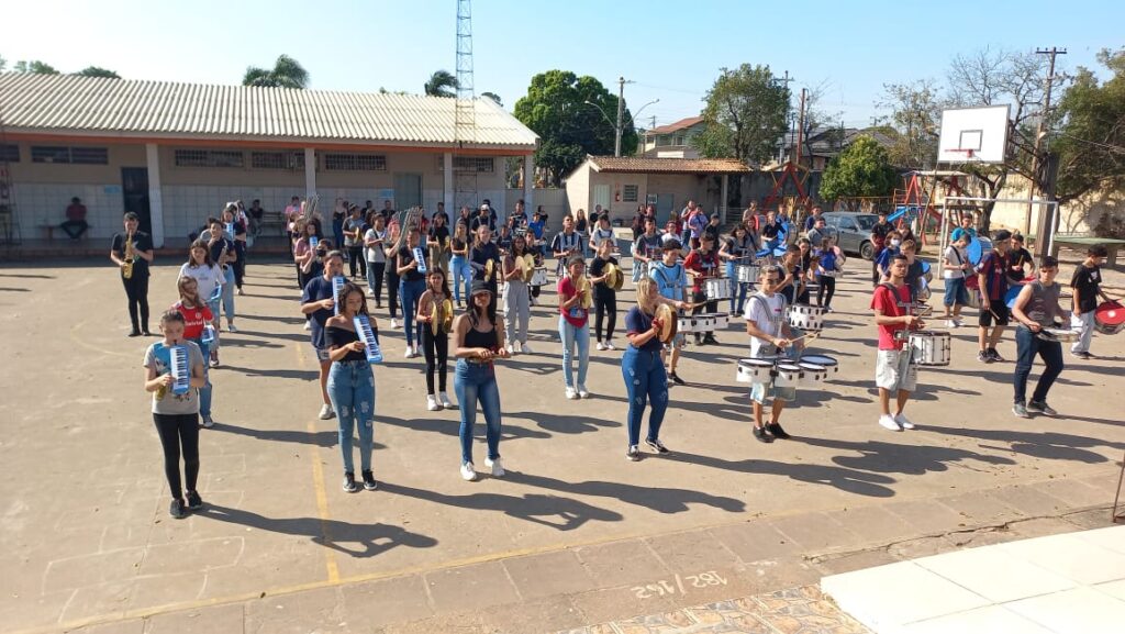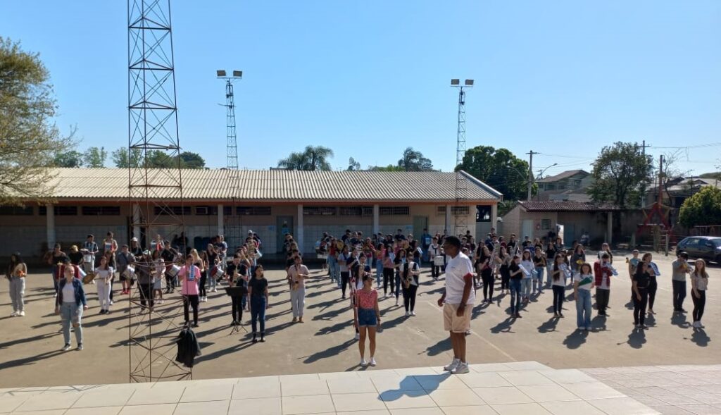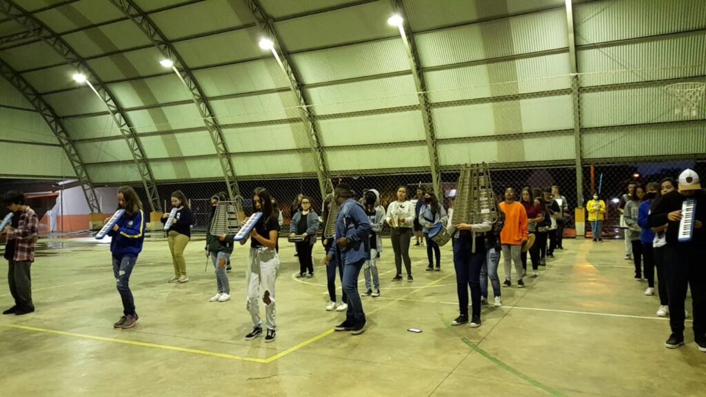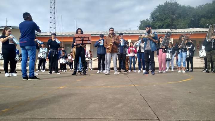 “Em 2020, com a situação da pandemia, o antigo regente/maestro da banda da escola Rosa Elsa Mertins, professor Newton Macedo, faleceu em decorrência de complicações da Covid, e a banda acabou tendo uma pausa nos ensaios. Eu assumi como regente no ano de 2021 e, desde então, sou regente de três bandas da rede municipal, e atualmente coordeno os ensaios do Colégio Santa Teresinha”, informa Buiú.