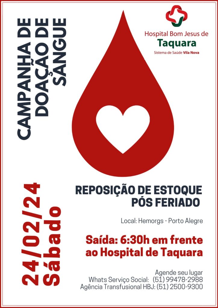 Segundo o Hospital Bom Jesus de Taquara, a doação de sangue será realizada no dia 24 de fevereiro, um sábado, no Hemocentro, em Porto Alegre. Às 6h30min, um ônibus sairá da frente do Bom Jesus, levando todos os doadores.