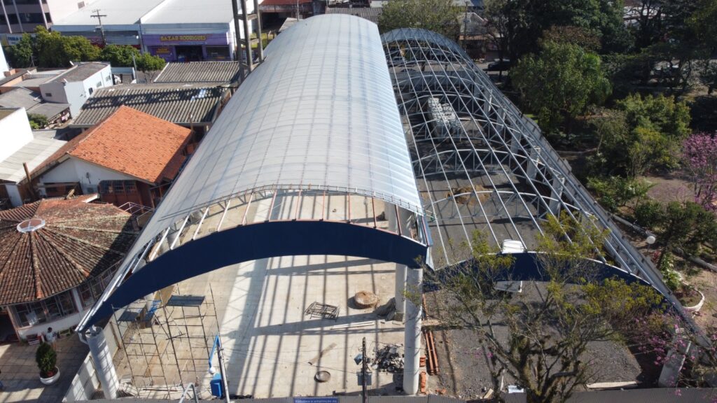 Dando sequência a obra de ampliação e revitalização da Rua Coberta da Praça 1º de Maio, em Parobé, a administração municipal começou a instalar a nova cobertura do espaço público, localizado no coração da cidade.