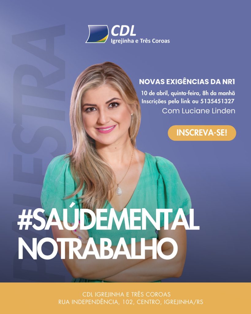 Mas o que muda e como as empresas devem se preparar? Para esclarecer essas questões, a psicóloga e consultora de carreira Luciane Linden ministrará a palestra “As Novas Exigências da NR-1”, em um encontro promovido pela CDL de Igrejinha e Três Coroas. O evento ocorrerá na quinta-feira (10/04), às 8h.