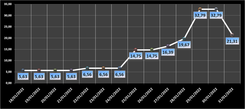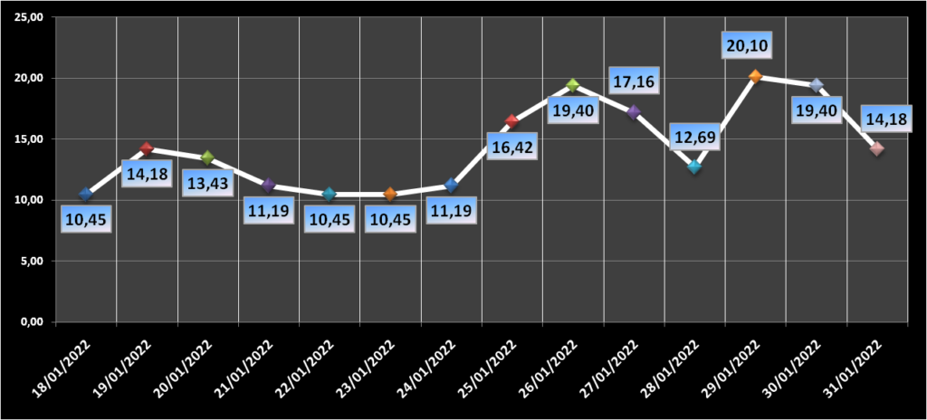 Gráfico da ocupação dos leitos clínicos nos últimos 14 dias.