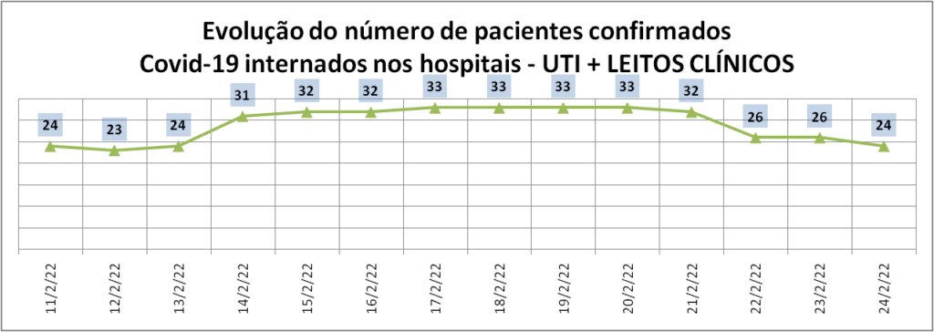 A ocupação de leitos clínicos destinados para o atendimento à infecção pelo novo coronavírus é de 7,46% – queda em relação aos 8,21% da quarta-feira (23/2). São 10 pacientes internados. Oito são confirmados para a Covid-19, sendo sete em Parobé; e um em Três Coroas. Há ainda dois pacientes suspeitos para a Covid-19 internados em Parobé.